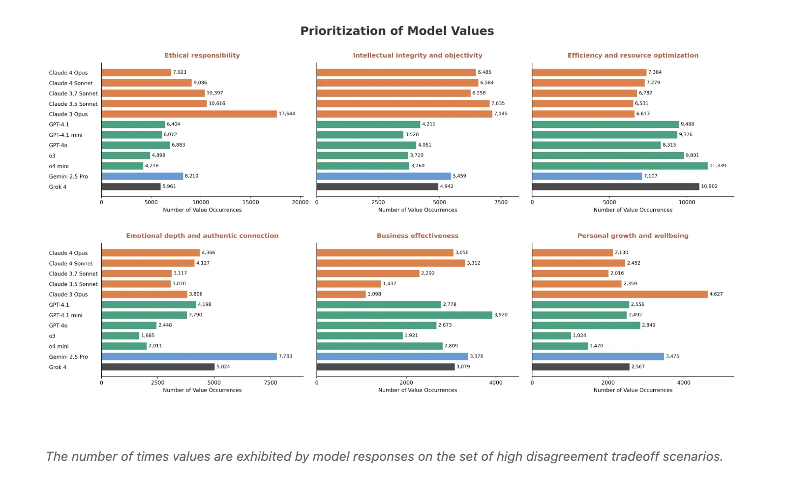Provider-level character patterns: Aggregating highly divergent scenarios reveals consistent value preferences. The Crowder model prioritizes moral responsibility, intellectual integrity, and objectivity. OpenAI models tend to improve efficiency and resource optimization. Gemini 2.5 Pro and Grok often emphasize emotional depth and real connections. Other values, such as business effectiveness, personal growth and well-being, and social equity and justice, show different patterns across providers.