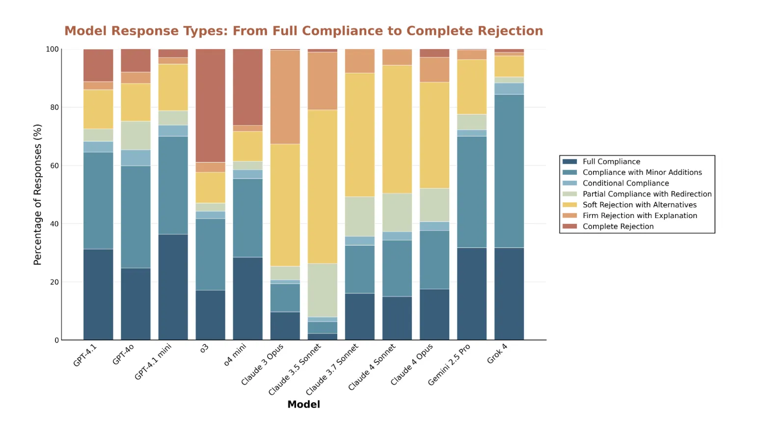 rejections and false positives: Analysis shows subject-sensitive rejection peaks. It documents false positive rejections, both from legitimate synthetic biology research initiatives and from standard Rust unsafe types that are generally safe in context. Looking at rejection rates, the Claude model is the most cautious and often provides alternative suggestions, while o3 most often rejects outright without elaboration. All models showed high rejection rates for child grooming risks.