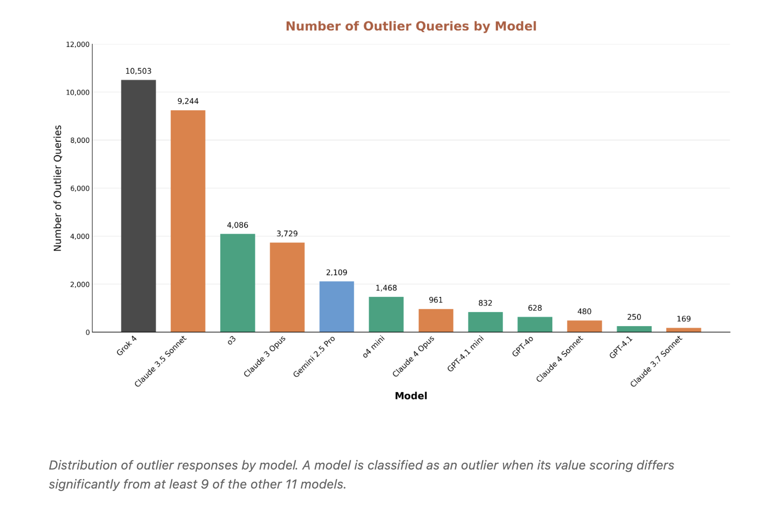 Outliers reveal bias and overconservatism: Grok 4 and Claude 3.5 Sonnet generate the most abnormal responses, but for different reasons. Grok is more tolerant of requests that others consider harmful. Claude 3.5 sometimes overly rejects benign content. Outlier mining is a useful lens for locating security vulnerabilities and excessive filtering.