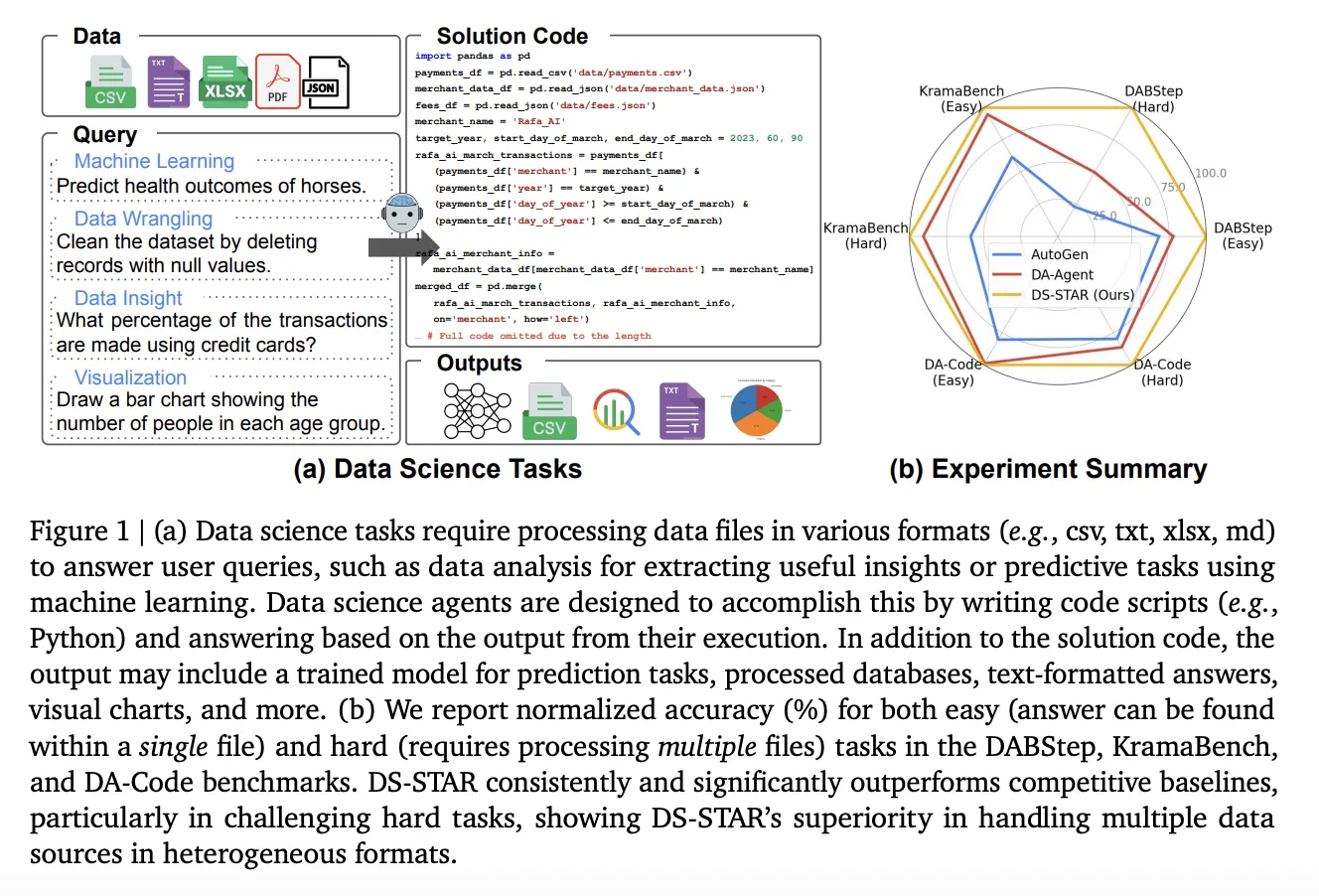 DS STAR changes abstraction. It generates Python code that loads and combines any files provided by the benchmark. The system first summarizes each document and then uses that context to plan, implement, and validate a multi-step solution. This design enables DS STAR to work on benchmarks such as DAB steps, Kramer Bench and DA codewhich expects multi-step analysis of mixed file types and requires strictly formatted answers.