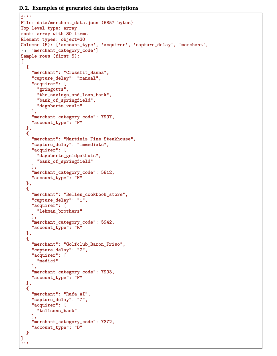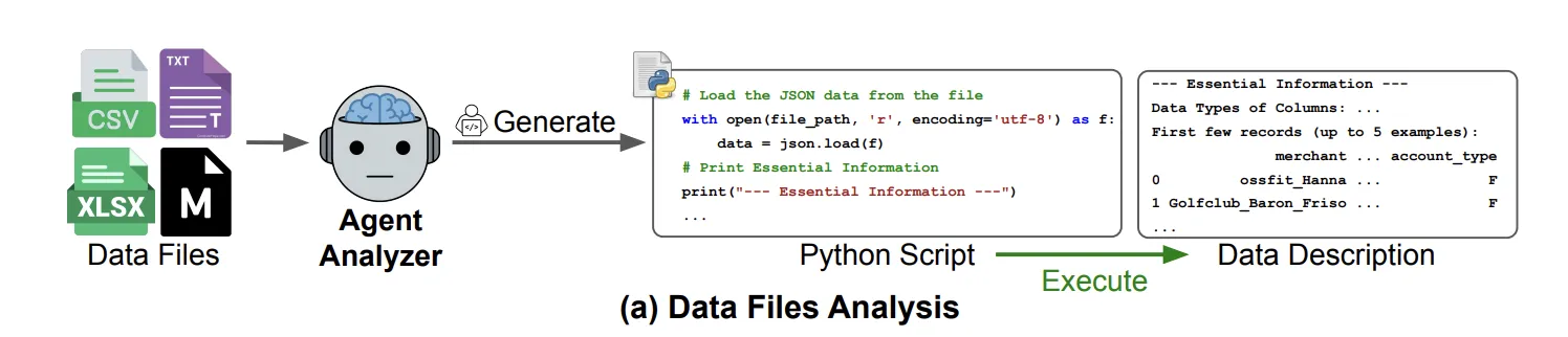 This process works for both structured and unstructured data. CSV files generate column-level statistics and examples, while JSON or text files generate structural summaries and key snippets. The set {dᵢ} becomes the shared context for all subsequent agents.
