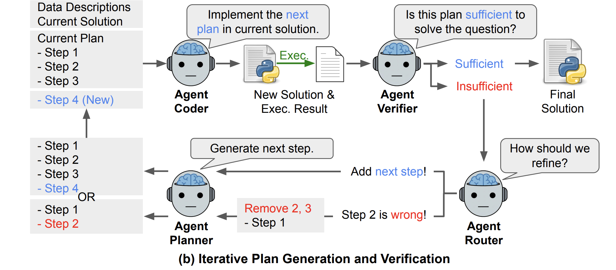 Aplanner is conditioned on the latest execution result (rₖ), so each new step explicitly responds to errors in the previous attempt. The cycle of routing, planning, coding, execution, and verification continues until Averifier marks the plan as sufficient or the system reaches a maximum of 20 rounds of refinement.