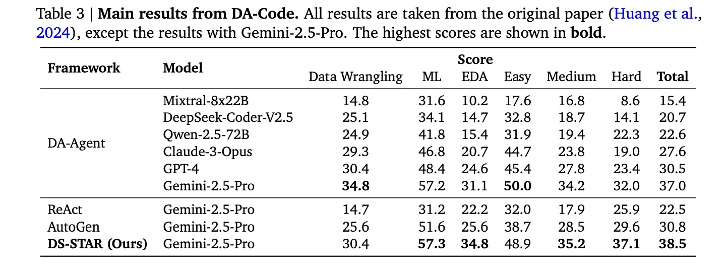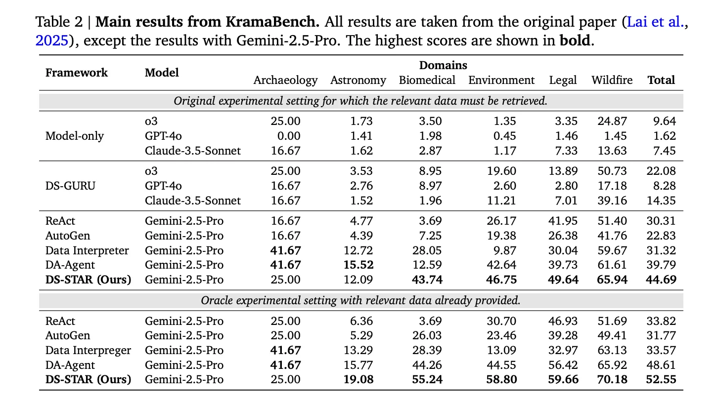 The Google research team reports that compared to the best alternative system in each benchmark, DS STAR improves overall accuracy from 41.0% to 45.2% on DABStep, from 39.8% to 44.7% on KramaBench, and from 37.0% to 38.5% on DA Code.
