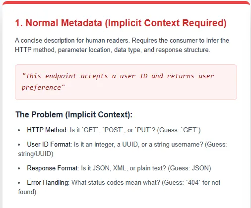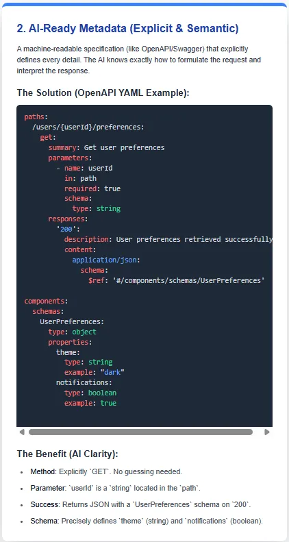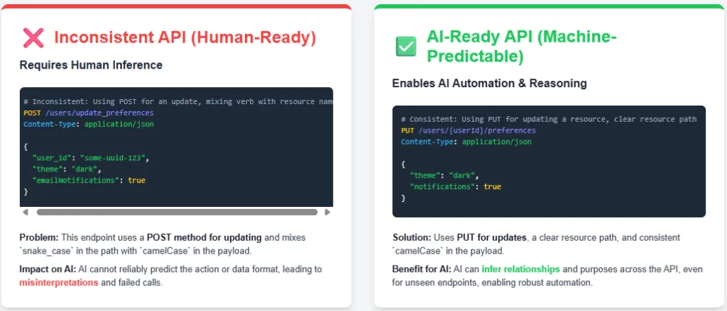 Humans can infer missing details from vague API documentation, but AI agents cannot—they rely entirely on explicit, machine-readable metadata. Instead of saying “This endpoint returns user preferences“An AI-ready API must define everything: request type, parameter schema, response structure, and object definition. Clear metadata like the example above removes ambiguity, ensures agents don’t guess, and enables the API to be fully understood by machines.