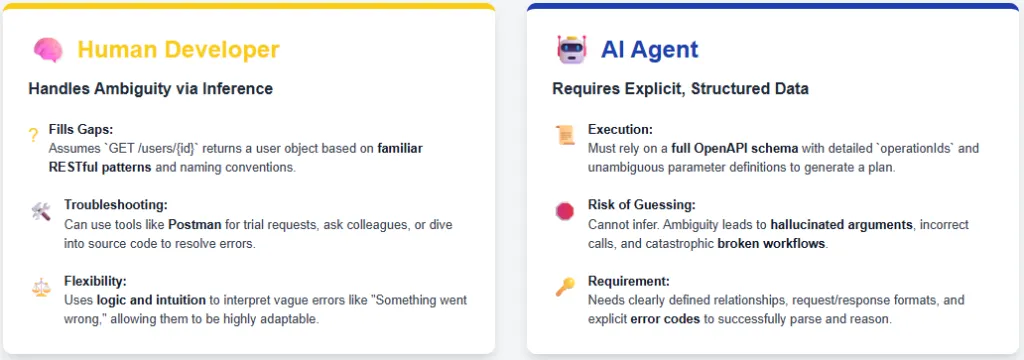 When documentation is unclear, humans can look things up, but AI agents can’t—they only know what your API explicitly tells them. Without clear, complete documentation, agents cannot discover endpoints, understand parameters, predict responses, or recover from errors. For an AI-ready API, good documentation isn’t optional—it’s the only way the agent can learn and reliably interact with your system.