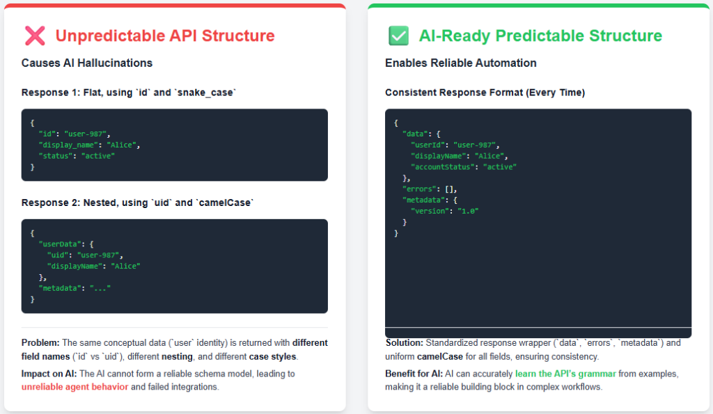 AI agents require strict consistency—the same input should always produce the same structure, format, and fields. Humans can use intuition to resolve inconsistent responses, but AI cannot hypothesize or investigate; it only learns from the patterns you provide. If naming, nesting, or errors differ between endpoints, the agent will become unreliable or crash entirely. To be AI ready, your API must enforce predictable responses, consistent naming, consistent error handling, and zero hidden edge cases. In short: inconsistent input leads to inconsistent agent behavior.