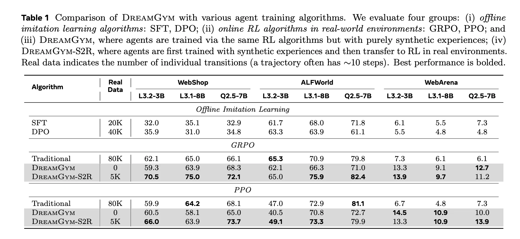 Internally within DreamGym, this strategy uses standard RL algorithms. The research team evaluated proximal policy optimization and group-relative policy optimization. Rollout alternates between policy selection operations and an experience model that synthesizes next states and rewards. From the perspective of the RL code, this is just another environment interface.