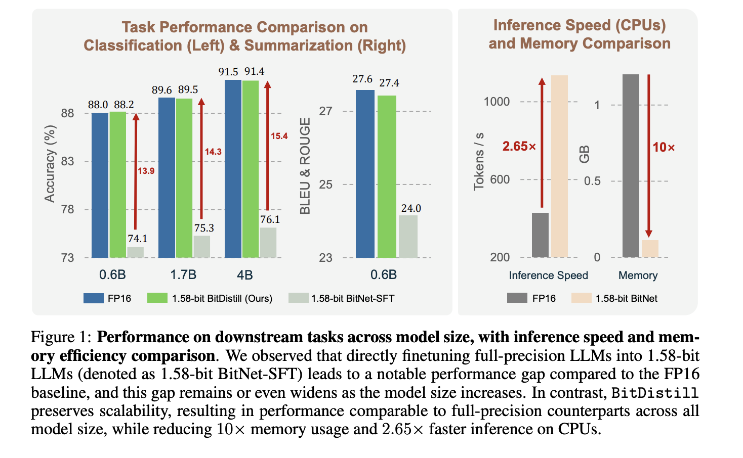 The research team evaluates classification, MNLI, QNLI, SST 2 and summarization on the CNN/DailyMail dataset. It compares three settings: FP16 mission fine-tuning, direct 1.58-bit mission fine-tuning, and BitNet Distillation. Figure 1 Shows that BitNet Distillation matches the FP16 accuracy of the Qwen3 backbone 0.6B, 1.7B, 4Bwhile the direct 1.58-bit baseline lags more as the model size grows. On the CPU, Tokens per second Raise approx. 2.65×memory decreased by approx. 10× For students. The research team quantified activation as INT8 and use pass-through estimator gradient through the quantizer.