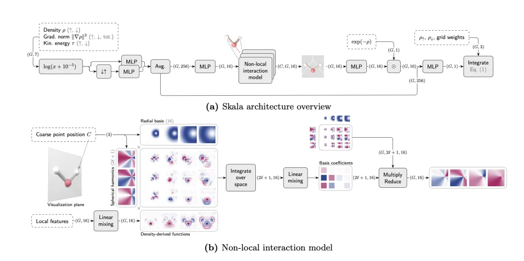 Skala evaluates meta-GGA features on a standard numerical integration grid and then Limited range, non-local neural operators (Bounded enhancement factor; precise constraint perception, including Lieb-Oxford, size consistency and coordinate scaling). The training is conducted in two stages: (1) Pre-training B3LYP Density Has XC tags extracted from advanced wave function energy; (2) SCF in-the-loop fine-tuning using Scala own Density (without backpropagation through SCF).