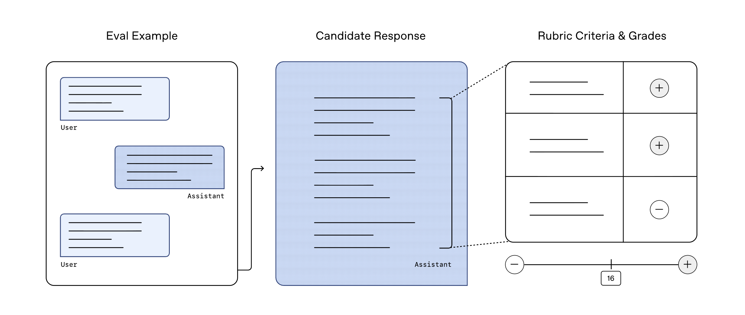 Model-based raters check candidate responses against these criteria and mark which ones are satisfactory. The final score is the sum of the weights that satisfy the criteria divided by the total possible score. This is like grading short exam answers, which supports partial credit and captures nuance and cultural correctness rather than just surface mark overlap.