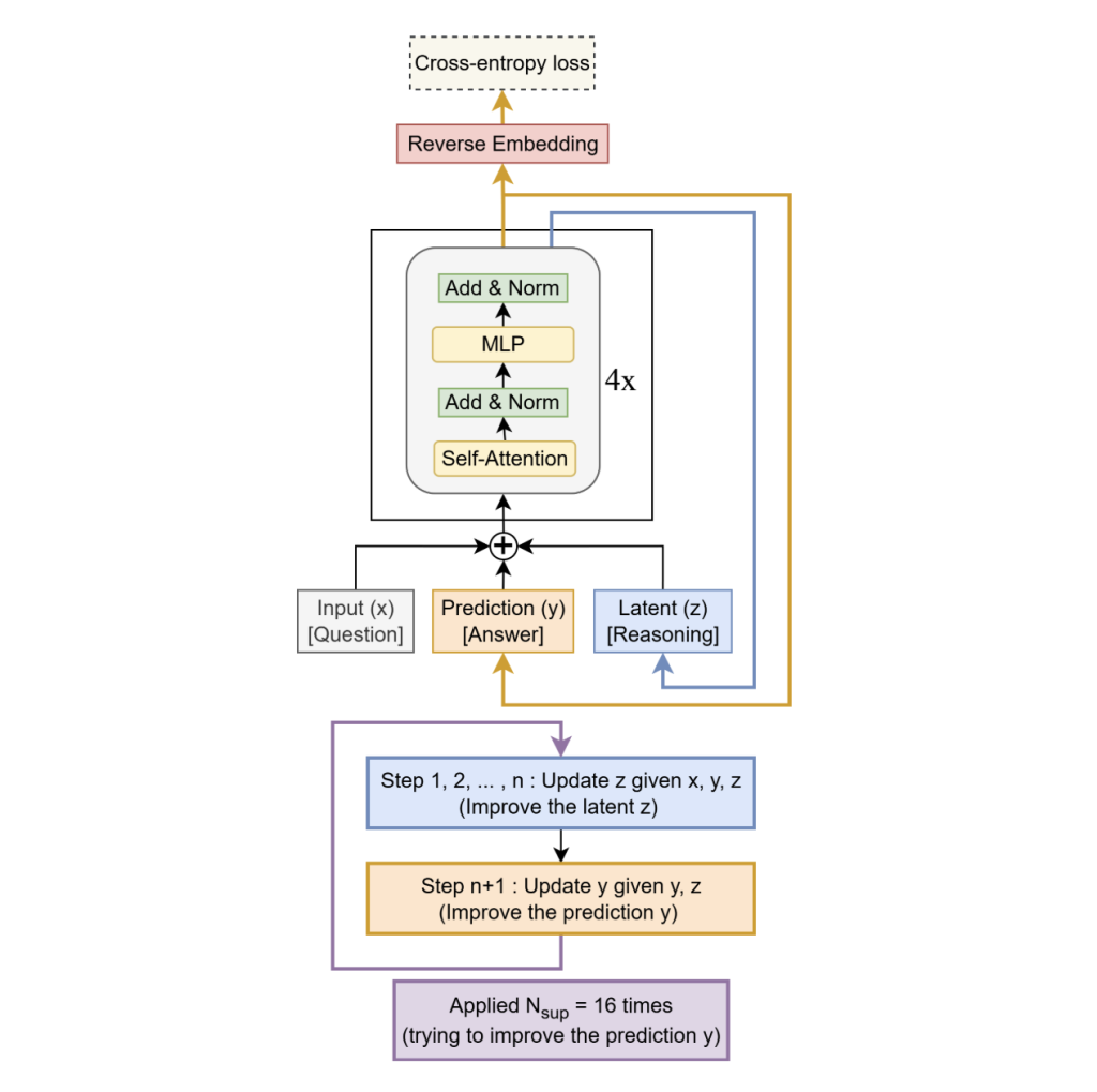 - architecture: A ~7M parameter 2-layer recursive solver, alternating between potential “think” updates π§βπ(π¦,π§)zβf(x,y,z) and “action” refinements π¦βπ(π¦,π§)yβg(y,z), unfolding up to 16 steps, with deep supervision; gradients are propagated via full recursion (no fixed-point/IFT approximation).
