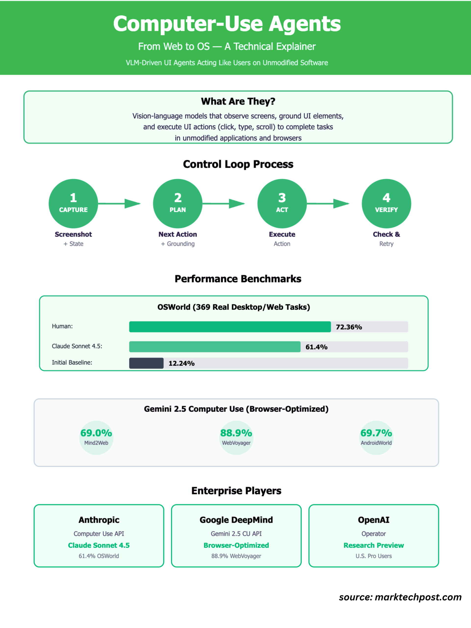 Long story short: The computer usage agent is a VLM-driven UI agent that behaves like a user on unmodified software. baseline at operating system world Started with 12.24% (human 72.36%); Claude Sonnet 4.5 Report now 61.4%. Gemini 2.5 computer use Lead a few network benchmark (Online-Mind2Web 69.0%, Online travelers 88.9%) but it is Not yet optimized for the operating system. The next step is to focus on Operating system level robustness, Sub-second action loopand Strengthen security policieswith a transparent training/evaluation program from the open community.